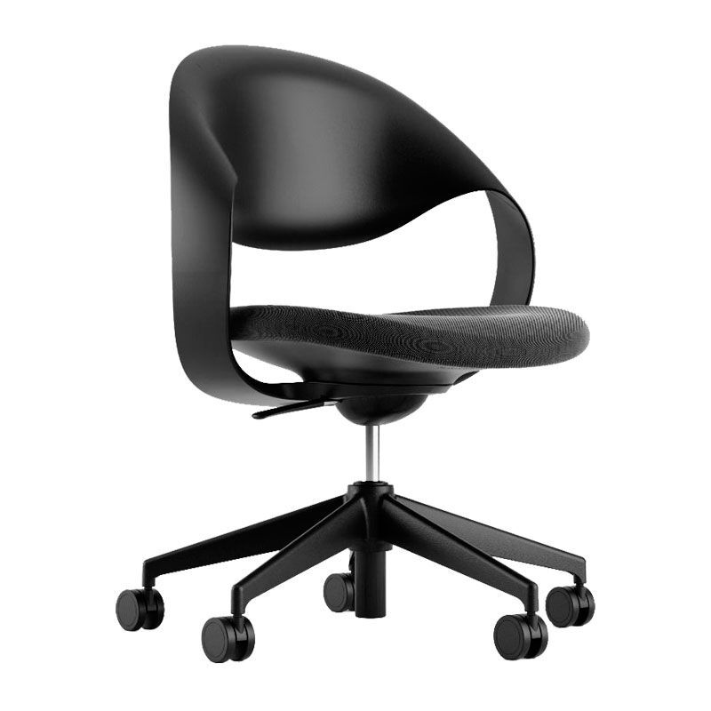 Asiento y respaldo en una sola pieza de polipropileno color negro con curvatura ergonómica . Asiento de espuma inyectado, tapizado en tela color gris plomo. Brazos fijos en polipropileno integrados a la estructura. Base de nylon de 26″ con radajas PU de 60 mm. Mecanismo con palanca para ajuste de altura y reclinamiento sin bloqueo.