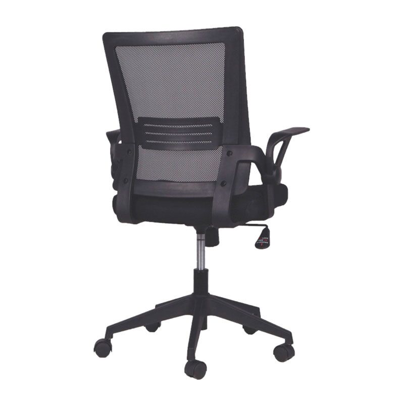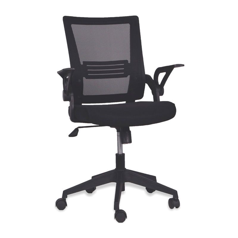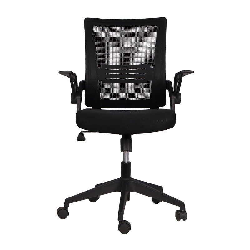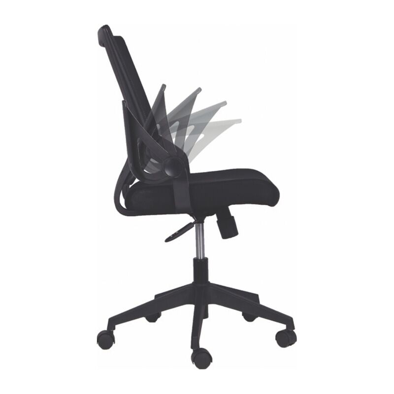 Brazo de polipropileno abatible en posición vertical, respaldo de malla y asiento de hule espuma de 24kg/m3 tapizado en tela import color negro, base spider nylon de 25″.