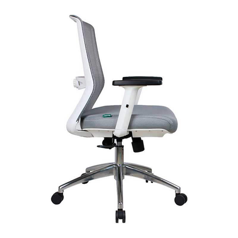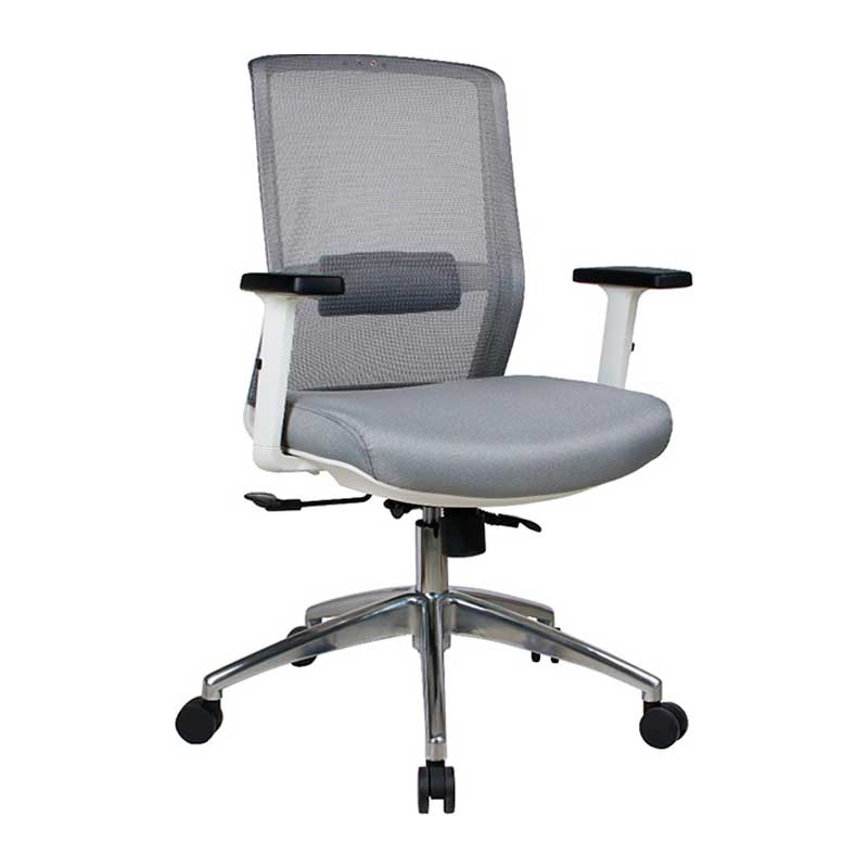 Brazo de polipropileno con ajuste de altura y pad de poliuretano inyectado. Respaldo con soporte lumbar con ajuste de profundidad. Respaldo de malla de poliéster, asiento grande de hule espuma de 24 kg/m3 tapizado en tela import gris. Base de aluminio de 27″ y pistón cromado. Mecanismo: palanca para ajustar altura, palanca de ajuste y bloqueo de inclinación de respaldo multiposición. Perilla para ajustar la tensión del reclinamiento. Color gris.